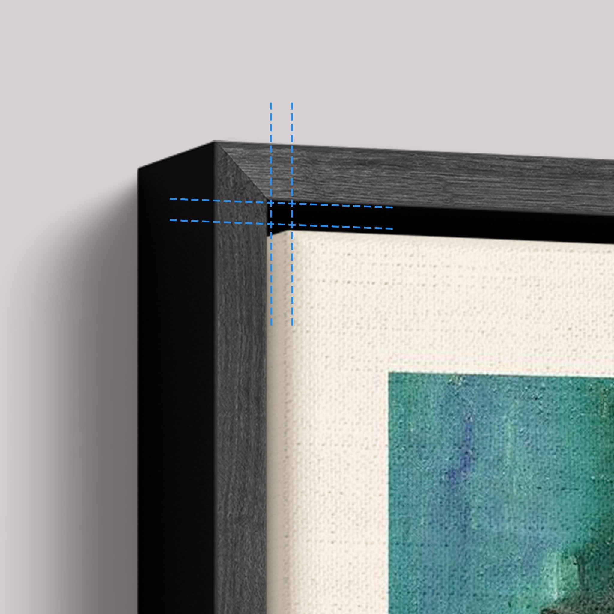 100% cotton canvas stretched on a frame, wrapped in a channel frame (0.7 cm front × 4.5 cm depth). 0.75 cm space between the canvas and frame, creating a floating effect. No glass.